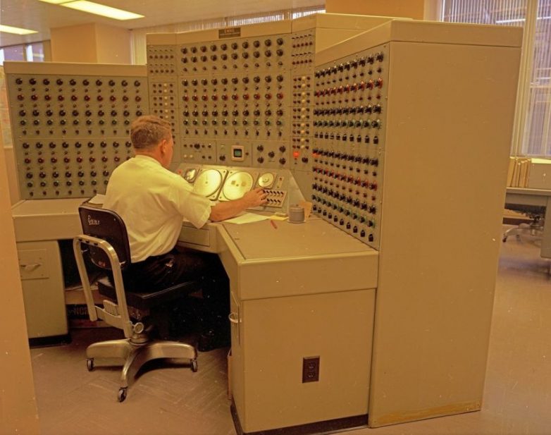 Мужчина работает над созданием новой модели компьютера, 1968