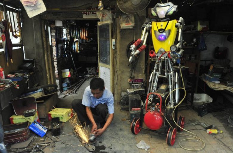 49-летний механик Ву соединяет вместе детали своего нового робота в мастерской.