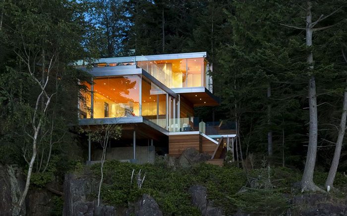 Дом на берегу озера построен на вершине скалы, окружён лесом, а попасть сюда можно лишь на лодке. Находится он на острове Гамбье в Британской Колумбии, возле Ванкувера. Создали его специалисты фирмы Mcfarlane Biggar Architects + Designers.