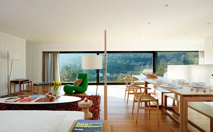 Ещё один пример чудесного дома, гармонично вписавшегося в окружающий его ландшафт, находится в испанской Галиции. Он представляет собой полузаглублённое здание, которое практически спряталось в склоне холма. Здесь расположены кухня, гостиная и столовая. Стеклянный куб обеспечивает панорамный вид, а навес для машины выполняет ещё функции патио с красивым бассейном.