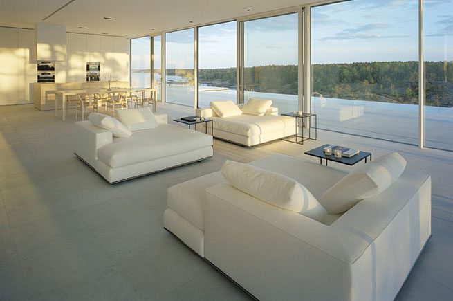 Дом у озера, созданный Джоном Робертом Нилссоном – идеальный пример сочетания природы с роскошью, при этом сохраняя атмосферу простоты и минимализма. Чисто-белая палитра, огромный окна от пола до потолка помогают стереть границу между интерьером и окружающим дом ландшафтом. Панорамный бассейн и углублённая лаунж зона гарантируют, что на свежем воздухе жильцы будут проводить больше времени чем внутри.
