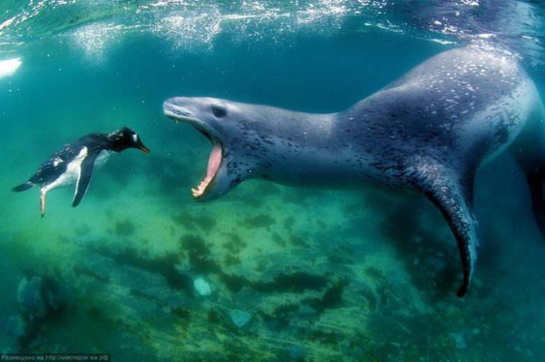 Интересные снимки! Вот, только, не понятно, что за зверь пытается слопать пингвина?