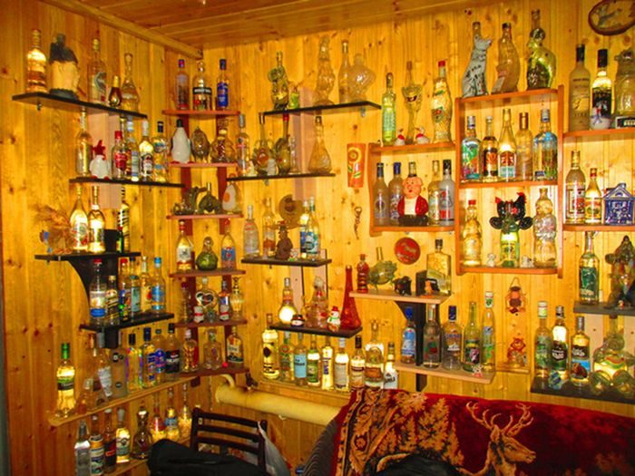 Коллекция бутылок из-под импортного алкоголя.