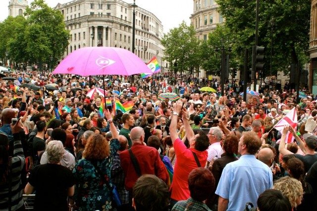В 2014 году члены ЛГБТ-сообщества шагают в окружении своих сторонников и групп поддержки.