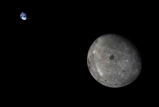 Вид Земли и Луны, запечатленный китайским спутником Чанъэ-5 в 2014 году.