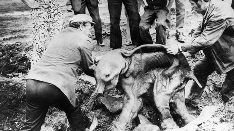 Двое мужчин поднимают хорошо сохранившуюся тушу мамонтенка, который был случайно откопан бульдозером из вечной мерзлоты в 1977 году.