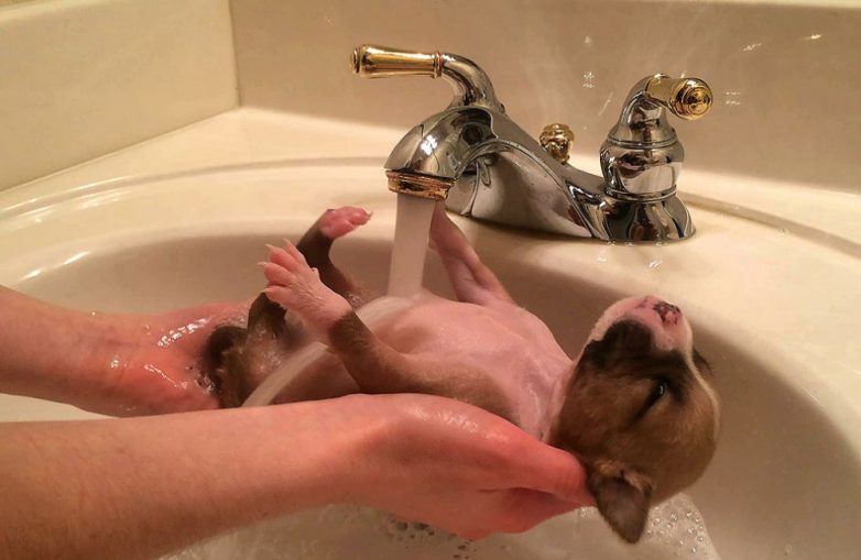 Щенка моют в раковине в приюте для животных в Далласе, США
