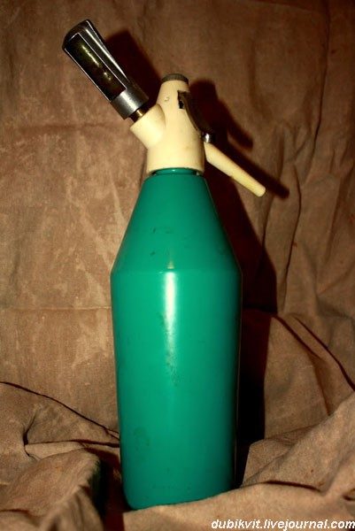 Выглядело это примерно вот так. Для того, чтобы получалась газировка, внутрь сифона нужно было залить воду (лучше с сиропом или вареньем) и в специальный разъем вкрутить газовый баллончик. При вкручивании у баллончика протыкался капсюль, и газ из него выпускался внутрь сифона. А если потом нажать на рычажок, то из сифона под давлением «вылетала» газированная вода.