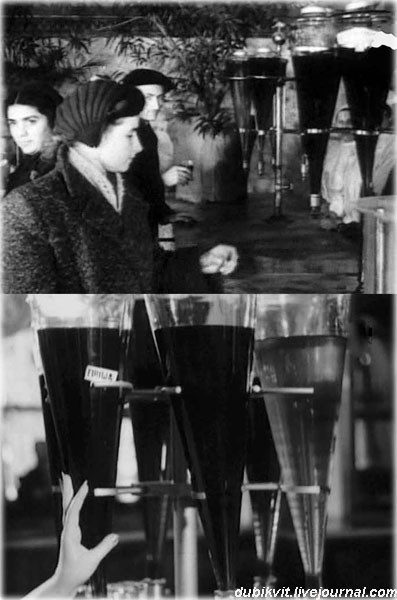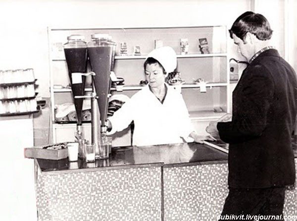 Но любой человек всегда мог прямо в магазине пропустить стаканчик своего любимого сока – помните, были такие отделы? Там стояли либо просто открытые банки, либо специальный перевернутые конусы с краником, куда сливали сок из банок, а большая тетка в белом халате и в колпаке наливала вам оттуда сок в стакан. И еще там обязательно стоял стакан с солью и чайной ложечкой. Это для томатного сока… И ведь за различным соком стояла очередь… Небольшая, но стояла…