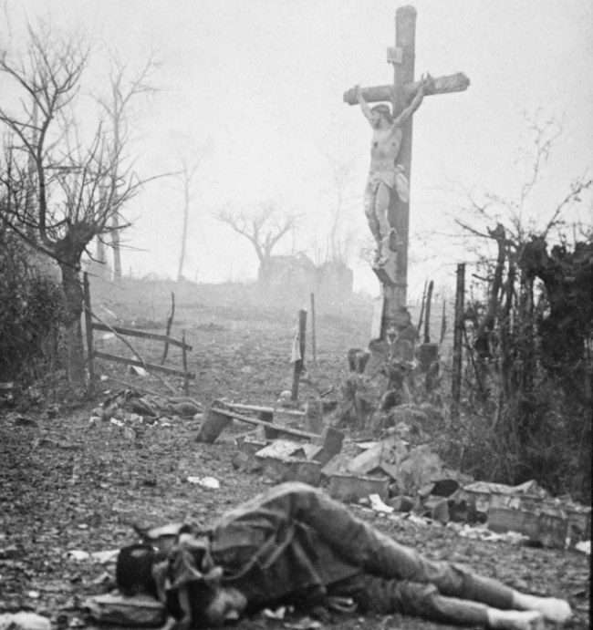 Мертвый солдат Первой Мировой около распятия. Сапоги уже сняли мародеры.