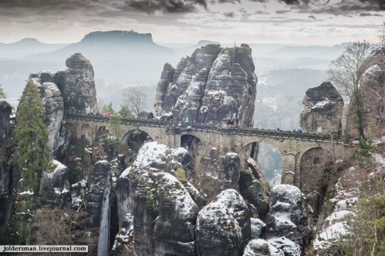 Бастайский мост в Саксонии — чудо инженерной мысли первой половины XIX века. Монументальное сооружение было построено из дерева в 1824 году, а спустя четверть века заменено на более прочную конструкцию из песчаника. Длина архитектурного памятника — 76,5 метров.