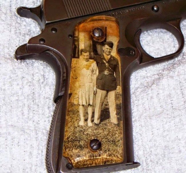Во время Второй Мировой офицеры Армии США прятали фотографии родных под плексиглассовыми накладками на рукояти пистолета.