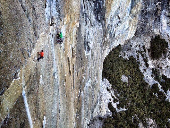 Профессиональный скалолаз цепляется за малейшие неровности на отвесной стене.