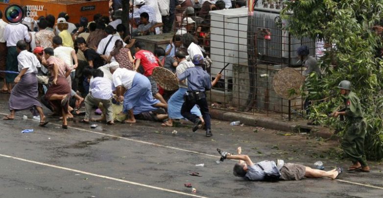 Репортёр из агентства APF, получивший ранение, когда полиция и военные в центре Янгона открыли огонь, а затем стали преследовать демонстрантов, пытается сделать снимки.