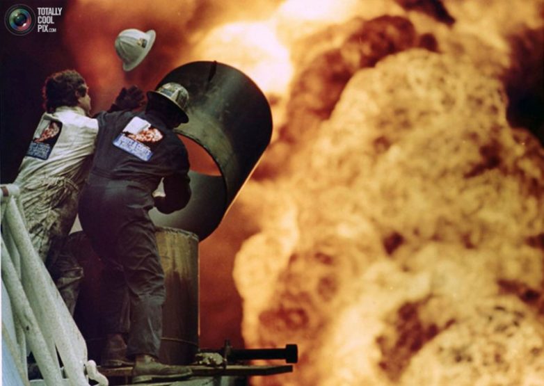 Пожарные, работающие на компанию Boots and Coots, пытаются потушить пожар на нефтепроводе.=====