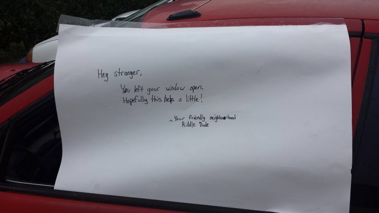 «Привет, незнакомец! Ты оставил окно открытым. Надеюсь, это немного поможет. Твой дружелюбный сосед»