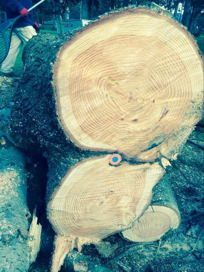 Ствол дерева и застрявший в нём мяч для гольфа.===