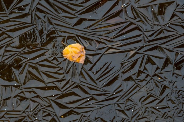 Березовый лист в замерзшей карельской луже.