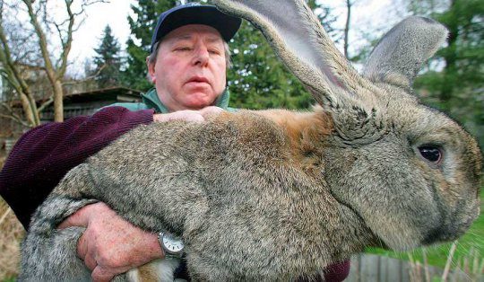 Немецкий фермер Карл Шмолински вырастил у себя гигантского кролика — он весит около 10 кг, а хозяин признается, что с трудом может удержать питомца на руках. Кролика зовут Роберт, и он знаменит на весь мир.