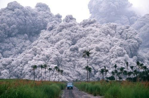 Водитель пикапа пытается сбежать от облака пепла, во время извержения вулкана Пинатубо на Филиппинах, 17 июня 1991 года