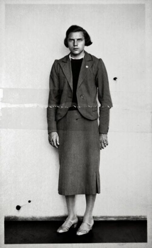 Дора Ратхен, атлетка олимпийской сборной Германии, арестованная на железнодорожной станции по подозрению в том, что была мужчиной, переодетая в женское платье, 1938