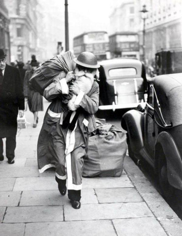 Санта в шлеме несёт подарки во время «Лондонского блица», 1940