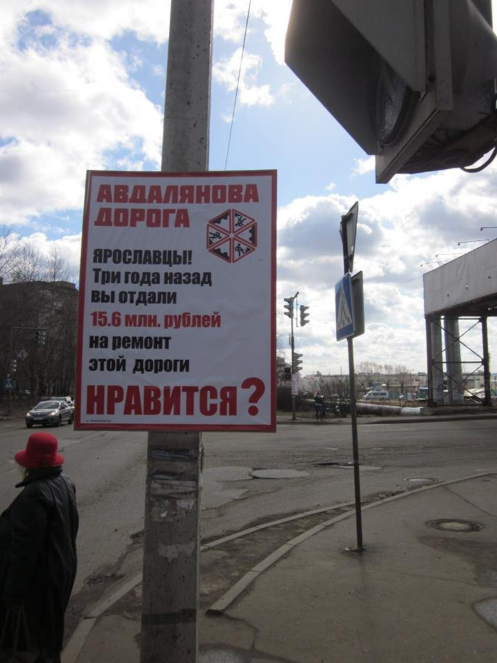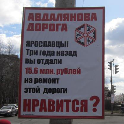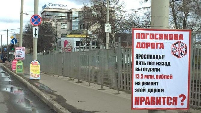 Вдоль дорог в Ярославле появились баннеры с надписями «Авдалянова дорога», «Погосянова дорога». На баннерах указано, сколько потрачено на ремонт дороги три года назад. И задается вопрос: «Нравится?»