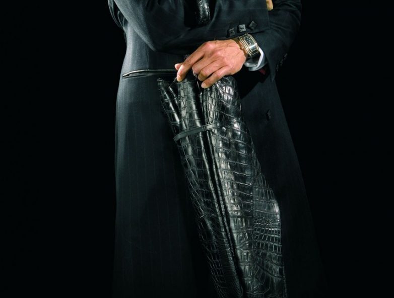 Мужской зонт, изготовленный из водонепроницаемой кожи крокодила. Это, в общем-то, всё, что отличает его от других подобных изделий. Никаких золотых вставок, инкрустаций бриллиантами и тому подобного здесь нет. Просто зонт из кожи за 2,5 миллиона рублей.