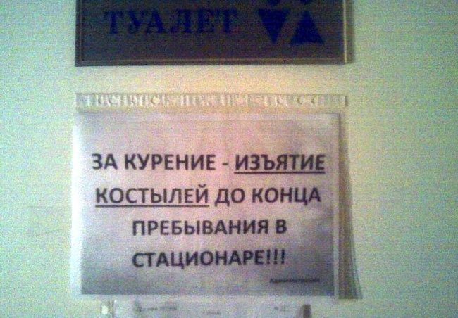 У нас в больнице, в приемном покое (занесло как-то) висят правила поведения для посетителей — ну, там, не шуметь, не сорить, вести культурно, одевать бахилы и т.д. Сверху приписали заголовок:«При передаче взятки врачу»