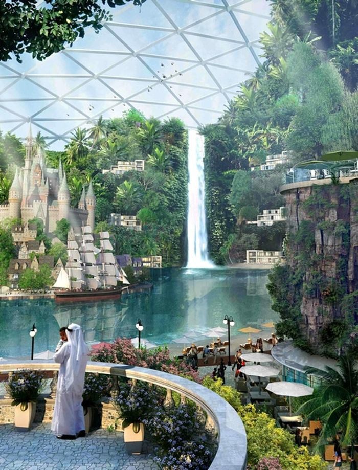 В Дубае строят первый в мире город под крышей. Его площадь составит 4-5 миллионов квадратных метров. Объекты инфраструктуры города будут связаны друг с другом семью километрами улиц, накрытых прозрачным куполом для поддержания комфортного температурного режима.