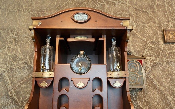 Кофемашина создавалась вместе с телевизором и постепенно переросла в большой проект: здесь же появилась барная стойка, сделанная по спецзаказу. Сверху — емкости для напитков. Снизу — несколько полок.