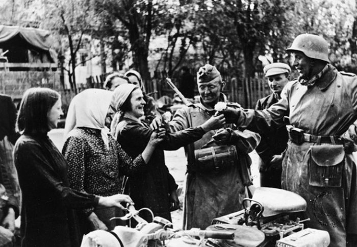 Жители Литвы встречают немцев. Часть местного населения ошибочно считала немцев своими освободителями.