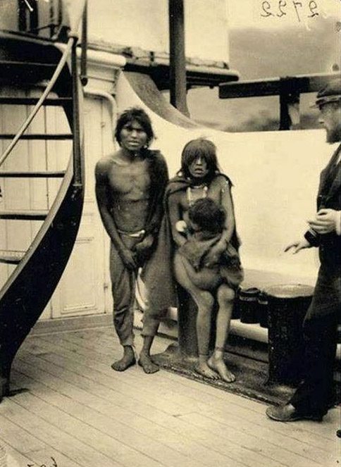 Представители индейского народа Сеькнам, на пути в Европу для участия в “выставке людей”. Чилийское правительство дало разрешение на их помещение там в качестве экспонатов.