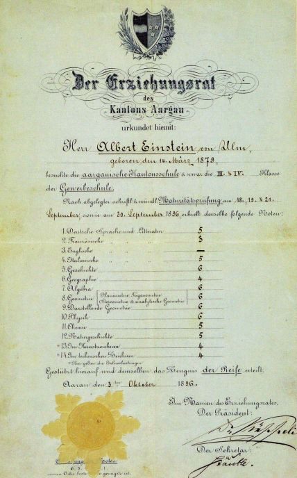 Школьный аттестат Альберта Эйнштейна, 1896 г. В Швейцарии шестибальная система оценок, от 1 (неуд.) до 6 (отлично).