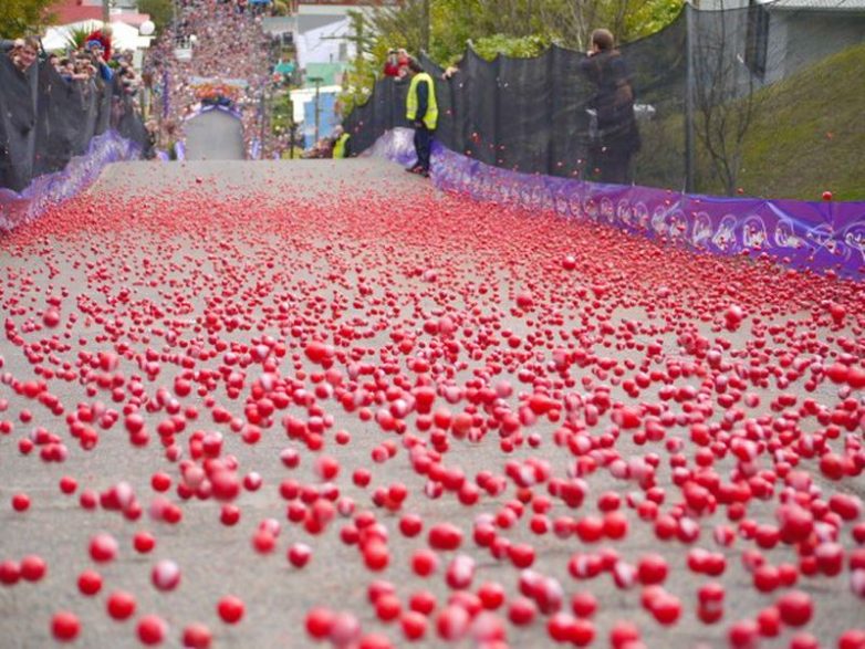 Кроме всего прочего, каждый год на Болудин-стрит происходит зрелищное «соревнование» конфет, которые нумеруют и спускают вниз. Победителем объявляют того, чья сладость первой попала в специальную воронку.