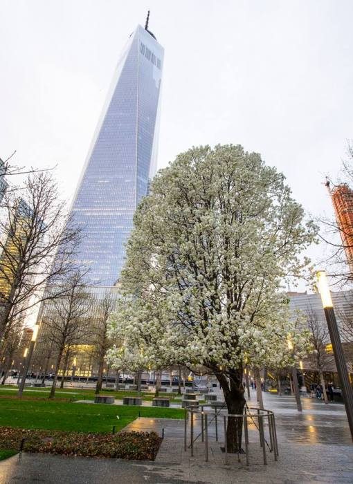 Дерево у здания нового Всемирного торгового центра в США, которое удалось спасти после теракта 11 сентября 2001 года.