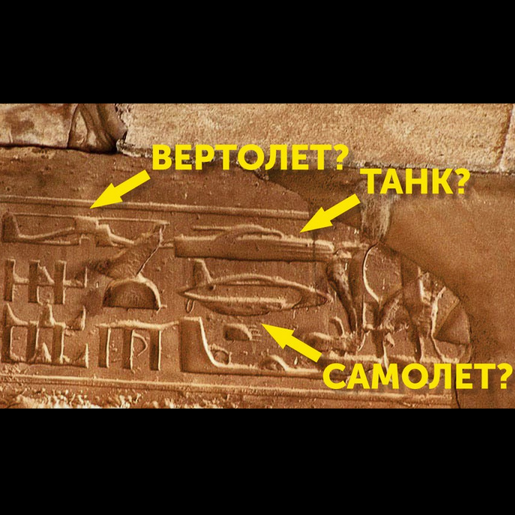 На одной из балок храма ученые еще в XIX веке обнаружили странные надписи, расшифровать которые им тогда не удалось. А с наступлением нового века египтологи уже по-другому взглянули на них. Оказалось, что там были выбиты изображения современной боевой техники: вертолетов, самолетов и танков. Как такое может быть, до сих пор остается загадкой. Некоторые египтологи считают, что эти непонятные иероглифы были созданы случайно, путем наложения одних символов на другие.