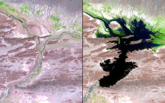 ПЛОТИНА МИРАНИ НА РЕКЕ ДАШТ (ПАКИСТАН) БЫЛА ПОСТРОЕНА В 2006 ГОДУ. Новое водохранилище дает воду для питья, орошения полей и работы ГЭС. Однако из-за избыточных осадков в 2007 году в окрестных районах жертвами наводнения стали 15 тысяч человек. На снимках: Дашт до (1999) и после (2011) строительства плотины (обилие зелени — новые сады и поля).