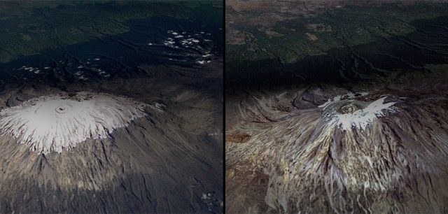 КИЛИМАНДЖАРО — ВЫСОЧАЙШАЯ ГОРНАЯ ВЕРШИНА АФРИКИ — В ФЕВРАЛЕ 1993 И 2000 ГОДОВ. На снимке видно, насколько «съежилась» ее ледяная шапка.