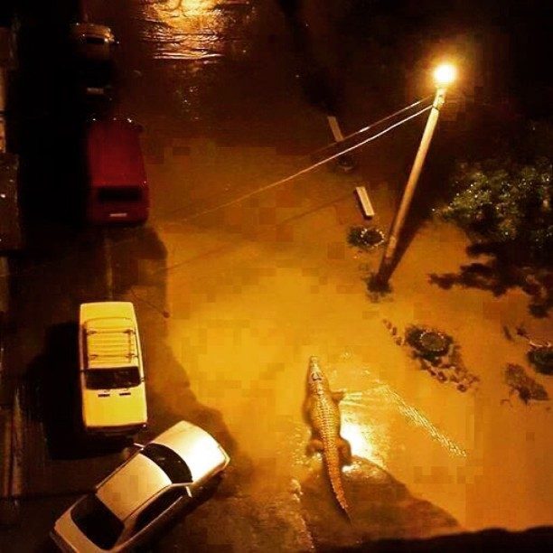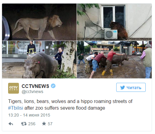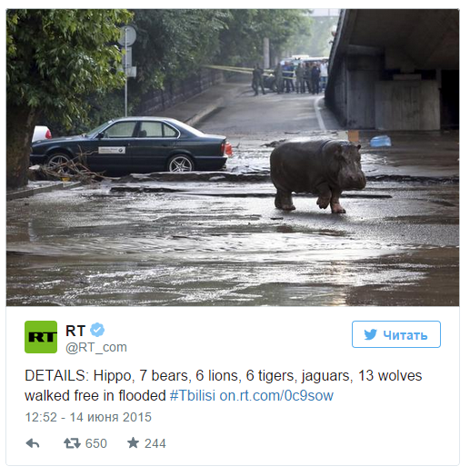В ночь с 13 на 14 июня на грузинский Тбилиси обрушился сильный ливень. Река Вере вышла из берегов, в результате чего оказался затоплен целый район: смыло дороги, машины, гаражи, жилые дома. Из-за наводнения оказался разрушен местный зоопарк: из него сбежало около 30 зверей, включая хищников.