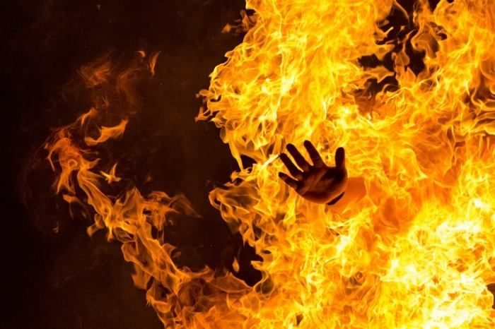 Человек прыгает сквозь огонь во время празднования дня летнего солнцестояния. Июнь 2015 года