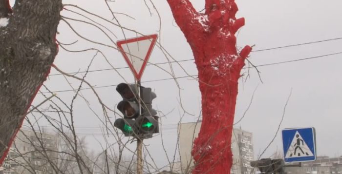 Работники новотрубного завода, который ожидал приезда Владислава Суркова, по-видимому, не знали, как лучше и поэтому решили покрасить деревья в красный цвет. Объяснили своё решение так: «Потому что они чёрные и некрасивые». Но маляры успели испортить только несколько деревьев. Приехал начальник муниципального учреждения «Городское хозяйство» и не дал завершить задумку.