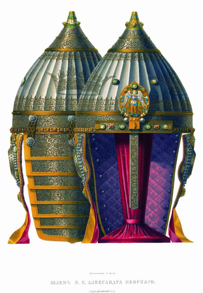 На шлеме Александра Невского, кроме алмазов и рубинов — арабская вязь, 3-й стих 61-ой суры Корана: «Обрадуй верных обещанием помощи от Аллаха и скорой победы».
