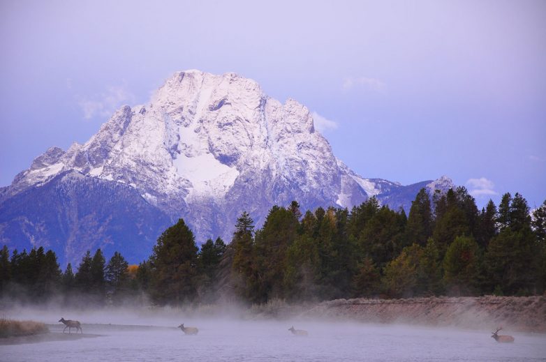 6. Вожак стада оленей следит за тем, как молодые самки пересекают реку, над которой появляются первые лучи солнца. Горный хребет Титон, Вайоминг