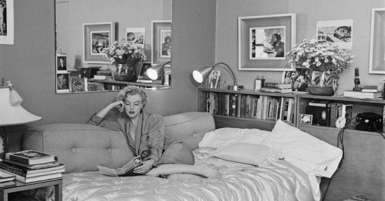 Мэрилин Монро отдыхает с книжкой на софе, 1951