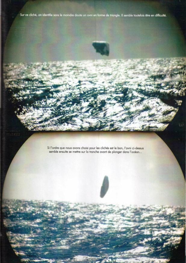 Вот фотографии, которые пришли с письмом. Мы представляем их в таком порядке, который считаем логичным, хотя это может быть не так, поскольку мы не знаем, взлетает ли объект, выходит из воды, или же заходит в неё… Стоит отметить, что на трёх фотографиях, представленных в наше распоряжение, копиях оригиналов, которые, очевидно, были получены в американской военной лаборатории, можно прочитать слева вверху: ОФИЦИАЛЬНАЯ ФОТОГРАФИЯ. ЗАПРЕЩЁНО РАСПРОСТРАНЕНИЕ. Справа внизу едва разборчивая надпись, частично стёртая временем: Несанкционированное раскрытие темы. Фотографии высокого разрешения доступны на нашем CDR.