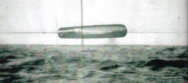 Серия фотографий начинается с той, что является безусловно самой впечатляющей. Кажется, она прошла через обработку отличную от той, через которую прошли следующие 3 фотографии. Это «сигара», сбитая ракетой и взрывающаяся на поверхности воды, или НЛО, поднимающийся из воды и готовый к взлёту? Обратите внимание, что на оригинале, представленном в наше распоряжение, нет никакой надписи.