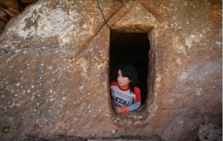 9-летняя Нихал смотрит на улицу из входа в подземную римскую гробницу, используемую в качестве укрытия от обстрелов и бомбардировок правительственных сил, в Джебель аль-Завейя, провинция Идлиб, Сирия. В северной Сирии повстанцы, солдаты и местное население активно используют древние и средневековые постройки как защитные сооружения в ходе продолжающейся войны в Сирии. Эти постройки сделаны из толстого камня, который уже прошёл испытания веками, и часто находятся в стратегических местах с видом на города и дороги.