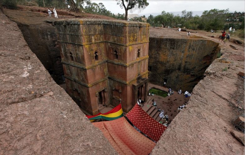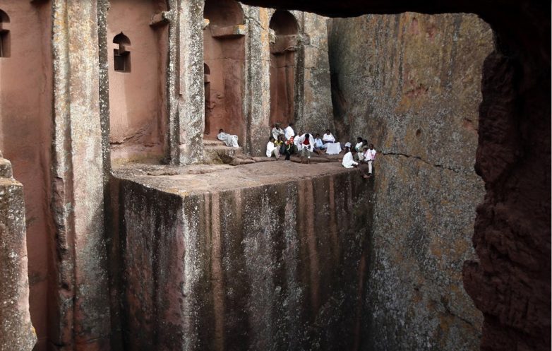 Люди молятся вблизи церкви Святого Георгия, одной из 11 известных монолитных церквей, построенных из скалы, во время празднования Страстной пятницы в Лалибеле, Эфиопия.
