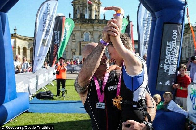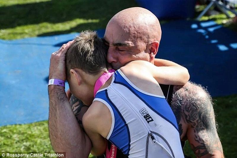 Гордый отец Джонатан Метьюз обнимает своего сына Бэйли, который несмотря на тяжелое заболевание, не только смог финишировать в турнире по триатлону, но и завершил крайние 20 метров без специальных ходунков